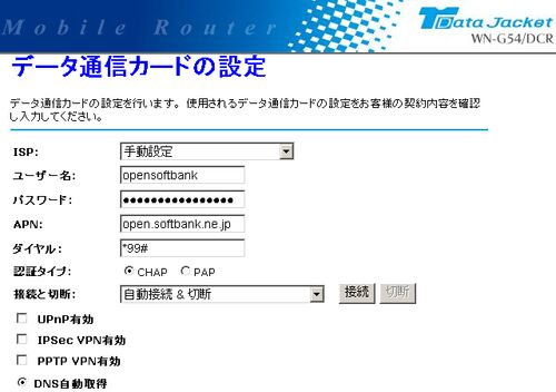 昨日のWN-G54/DCRに関するエントリで「Open接続を試してみよう」と書きましたが、早速やってみました。 ブラウザで管理画面にアクセスしOpenSoftBankの接続設定を作成し… USBモデムを挿しても赤いランプが点灯したまま。 もちろんネット接続できません。 実…