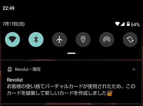 この時チャージに使ったのはRevolutのディスポーザブルバーチャルVISAカード(1回使い捨てのバーチャルカード)なのですが、Revolutの「ディスポーザブルバーチャルカードが利用された」という通知は届いたので、決済自体は行われているはず。