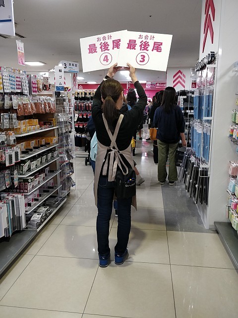 レジ待ちの列が長くなりすぎて列の起点が分かりにくくなり、店員が「最後尾」の札を持って立つ必要がある程になっていました。