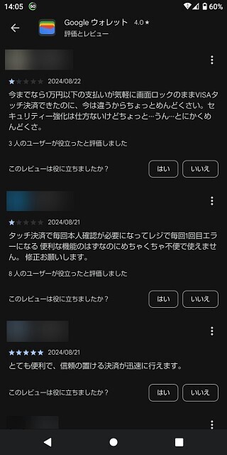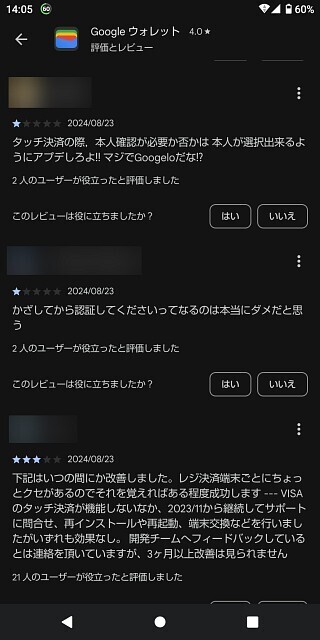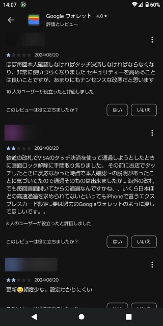 当然同じ不満を持つ人は私だけではなく、それもあってかGoogleウォレットアプリのユーザーレビューは酷評の嵐。